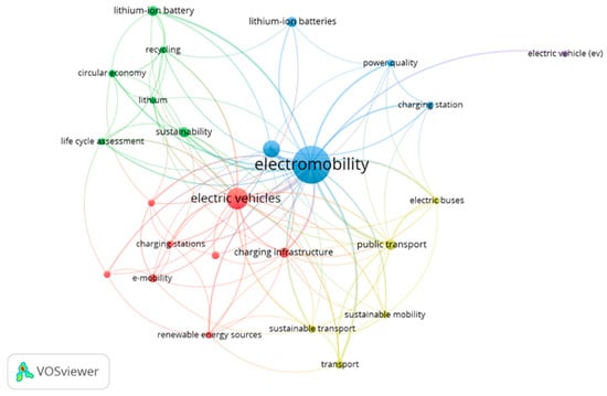 Figure 4 shows the co-occurrence map related to “electromobility” obtained with the VOSviewer software (version 1.6.20). It highlights a close relationship with sustainability, charging infrastructure, and public transportation.