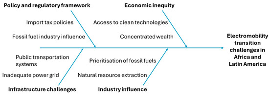 Another significant obstacle is the extraction of natural resources in Latin America. These resource-based economies often experience uneven development. At the same time, the broader population faces adverse social and environmental impacts caused by these processes. This legacy of resource extraction has created significant barriers to adopting renewable energy technologies. Public transportation systems are prevalent in many Latin American cities, but are often ineffective during peak usage. The growth of the digital economy, maritime navigation communication, and the increased availability of alternative energy sources offer potential pathways to help address these challenges [90]. Figure 5 illustrates the cause-and-effect aspects of the obstacles presented in developing countries for the electromobility transition.