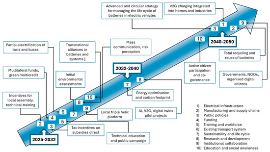 Electromobility roadmap; From 2025−2032 the corresponding references are: (2) [40,41]; (3) [21,76]; (4) [48]; (5) [5,16,40]; (6) [6,77]; (7) [7,61]; (8) [4,17]; (9) [4]; and (10) [5,79]. From 2032−2040 the corresponding references are: (7) [3,8]; and (8) [3,8]. From 2040−2050 the corresponding references are: (1) [14,15,80,81]; (2) [43,52,73,74]; (3) [2,22,75]; (9) [22,36]; and (10) [19,48].