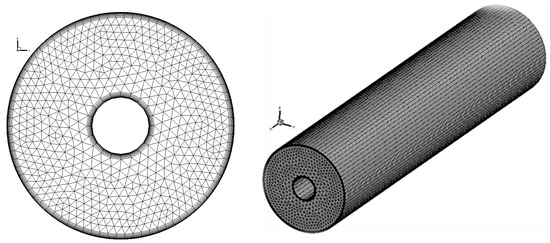 To ensure the accuracy of the computational results, for each operating condition, the dimensionless distance between the first inner node and the wall was strictly assessed to meet the condition ≈ 1, and grid independence verification was also conducted. Table 1 and Table 2 present variations in the heat transfer characteristic values of concentric annular pipes with a Reynolds number of 18,000 and an inner-to-outer diameter ratio of 0.25 as a function of the number of grids, in “A × B” format. Here, A represents the number of grids on any cross-section of the concentric annular pipe, and B denotes the number of grids in the axial direction within the concentric annular pipe. When the number of grid divisions was 2058 × 200, this approach produced a grid-independent solution. Figure 1 shows a schematic diagram of the mesh grid for a three-dimensional smooth and straight concentric annular pipe with a Reynolds number of 18,000 and an inner-to-outer diameter ratio of 0.25.