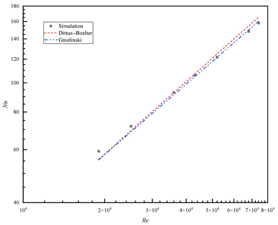Numerical simulations of turbulent convective heat transfer in a circular pipe were conducted for seven different Reynolds number groups from 104 to 1.2 × 105. Table 3 presents the Reynolds numbers and their corresponding inlet velocities. The numerical results indicated that the relative errors between the Darcy resistance coefficient and the calculated values from the Blasius formula [9] and the Filonenko formula [6] were within 8.04% and 10.03%, respectively. The absolute values of the relative errors between the turbulent heat transfer Nusselt number and the calculated values from the Dittus–Boelter formula [5] and the Gnielinski formula [6,7] were within 6.43% and 6.96%, respectively. The calculated results were in good agreement with those obtained from experimental correlation methods, indicating that our numerical methods and grid division strategies have good predictive capabilities and that the simulations provide reliable results. Figure 2 compares the Nusselt number of turbulent heat transfer in a circular pipe obtained from a simulation using the realizable k–ε model with values calculated from experimental correlations.
