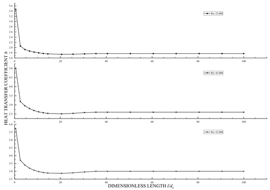 As shown in Figure 3, as the fluid flowed in the inlet section, a thermal boundary layer gradually developed (thickened), and the local surface heat transfer coefficient initially rapidly decreased. As the moving boundary layer developed, the intense mixing caused by turbulence disturbances and fluid micro-groups increased the local surface heat transfer coefficient. Once the fully developed stage was reached, the local surface heat transfer coefficient approached a constant value. Additionally, the length of the thermal entrance region remained mostly unchanged across three different Reynolds numbers, indicating only a weak relationship with the Reynolds number. This is consistent with the results of Tao W. Q. [34], who stated that as long as l/d > 10, the influence of the entrance section during turbulence becomes negligible due to intense mixing between fluid micro-groups. This is also in agreement with Babus’Haq’s [15] experimental results, further validating the reliability of the numerical simulation method and grid partitioning strategy chosen in this paper.