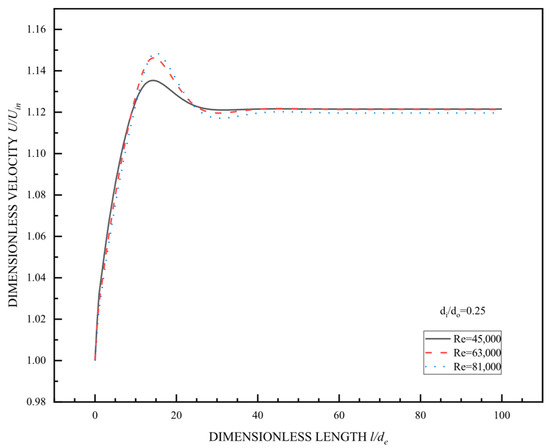 As shown in Figure 4, all dimensionless velocity curves tended to plateau at l/de = 20–40, indicating that the flow was fully developed within 20–40% of the pipe length. The length of the velocity entrance section increased with the Reynolds number. The axial velocity on the center-symmetric plane first reached a maximum before stabilizing within the range of 1.12 to 1.16, indicating that the flow was dominated by the central area of the pipe. The velocity distribution was hardly affected by the wall viscosity. The curves at different Reynolds numbers showed significant separation during the development stage. As the Reynolds number increased, the peak velocity rose higher and stabilized slower, while the velocity variation in the low Reynolds number curves remained relatively smooth. This indicates that at high Reynolds numbers, the flow was more prone to form an accelerating core effect due to the dominance of inertial forces. Once stabilized, the dimensionless velocities corresponding to different Reynolds numbers exhibited differences, indicating that the Reynolds number changed the average velocity in the core region by influencing the intensity of turbulence and viscous dissipation in the flow. All curves remained stable after sufficient development without any periodic fluctuations or intensified turbulent pulsations.