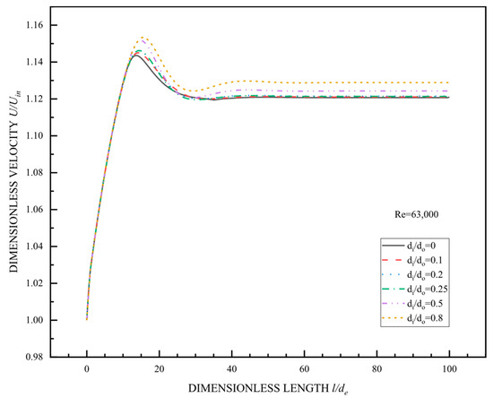 Figure 5 shows the variation curves of the dimensionless velocity along the center-symmetric plane for concentric annular pipes and circular pipes with inner-to-outer diameter ratios of 0.1, 0.2, 0.25, 0.5, and 0.8 at Re = 63,000. The comparison showed that at the same Reynolds number, the length of the velocity inlet section for the circular pipe was the shortest and increased with the inner-to-outer diameter ratio. After entering the fully developed section, the velocity was slightly lower than the peak value. The magnitude of the velocity peak increased with the inner-to-outer diameter ratio, and the position shifted upstream. Below the fully developed section, the increase in the inner-to-outer diameter ratio still led to an increase in the dimensionless velocity within the corresponding pipeline.