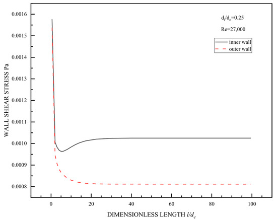 Figure 6 shows that the shear stress on the inner wall surface was always higher than that on the outer wall surface, especially in the fully developed segment, where the difference between the two was more pronounced. The steep decline in the initial section reflects a significant entrance effect, where there was a notable instability in the flow velocity. As the fluid flowed into the fully developed section, the shear stress gradient decreased, and the outer wall reached a steady state earlier than the inner wall. This means that in scenarios when the shear stress exceeds the material’s yield threshold, the inner wall surface is expected to reach a critical flow instability first, while the outer wall surface will experience a similar phenomenon later. This has significant implications for the safety and design of casing heat exchangers and provides critical reference parameters for optimizing the thermal management of concentric annular pipes (where the outer wall surface requires enhanced cooling). This can also help with wear-resistant designs (where the inner wall surface should be prioritized for protection), as well as the flow distribution.
