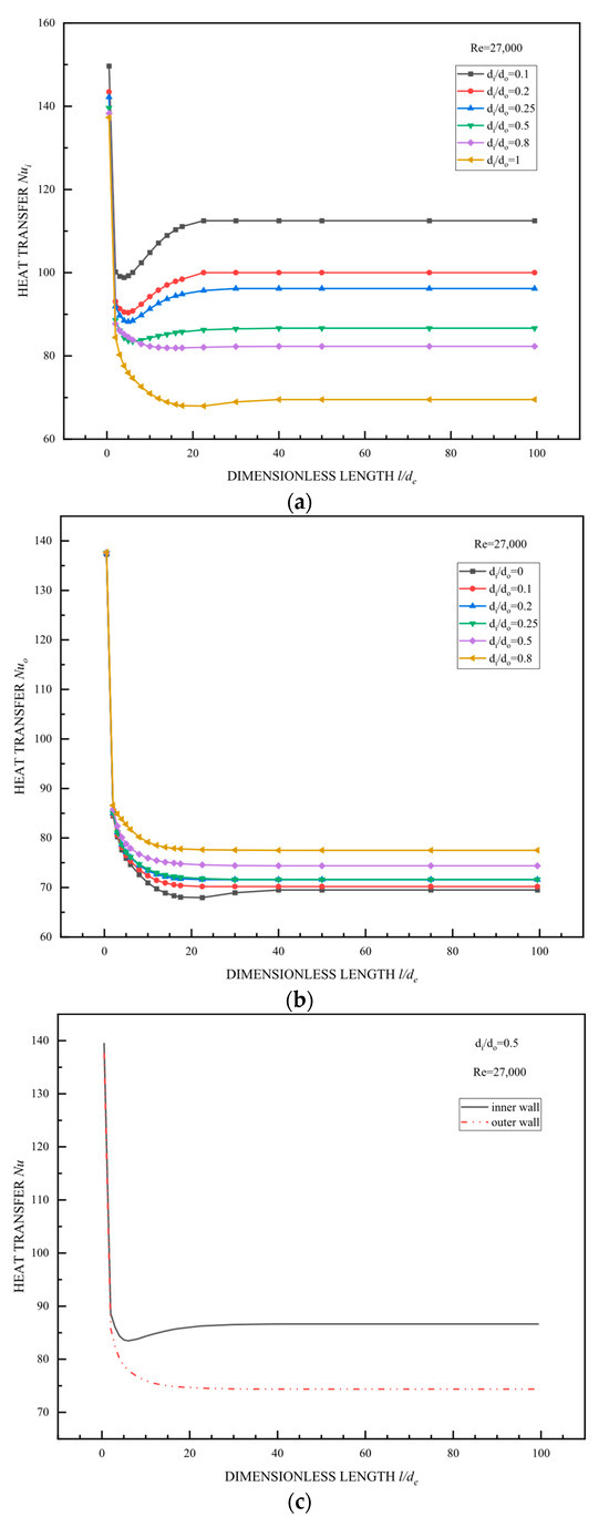In general, as the inner-to-outer diameter ratio increases, the annular gap decreases, as does the fluid passage space, increasing the flow velocity. A high flow velocity enhances turbulent disturbances, disrupts boundary layer stability, reduces boundary layer thickness, decreases thermal resistance, significantly improves the heat transfer coefficient, and substantially enhances heat exchange. Figure 7c shows that the Nusselt numbers on both the inner and outer wall surfaces decreased rapidly during the initial stage of flow before stabilizing. The Nusselt number on the outer wall surface was consistently lower than that on the inner wall surface, and it decreased faster.