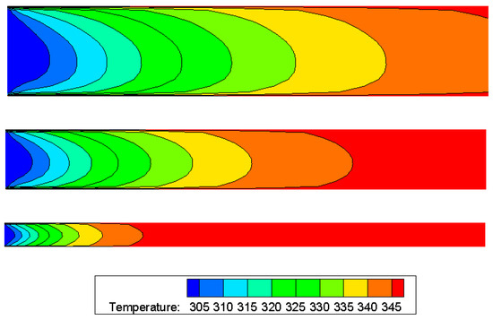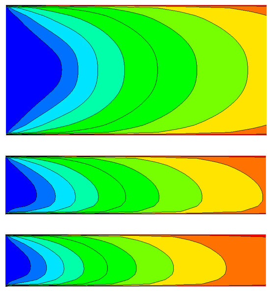 Figure 8 shows that all pipes exhibited a significant axial temperature gradient, with high-temperature zones (red/orange) concentrated at the pipe outlet and low-temperature zones (blue/green) concentrated at the pipe inlet. This indicates that the fluid was heated. As the inner-to-outer diameter ratio increased (narrowing the passage from top to bottom), the temperature gradient significantly strengthened (the distance between adjacent color bands decreased), the temperature difference between the inlet and outlet widened, and the curvature of the isotherms increased. This arose from the reduction in the annular gap, which increased the flow velocity and enhanced the convective heat transfer coefficient (h value increased). This also ultimately increased the heat transfer characteristic values and intensified surface heat transfer.