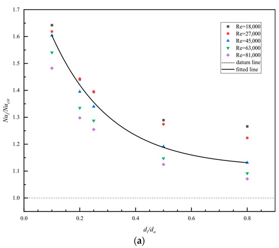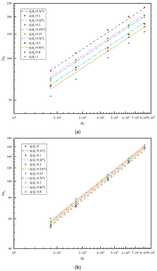 Correction coefficient models that consider the effects of variable properties, helical tubes, transition regions, and rough tubes already exist [35,36,37,38]. Combining these with the variations in the Nusselt number on the inner and outer wall surfaces of the concentric annular pipe (Figure 9), we accounted for how the geometric factor affected the flow and heat transfer in the concentric annular pipe, i.e., variations in the inner-to-outer diameter ratio. Our method introduced a correction coefficient for the inner-to-outer diameter ratio, in which we multiplied the right side of the existing correlation expressions for turbulent heat transfer in circular pipes by Cdi or Cdo. The resulting calculation formula is: