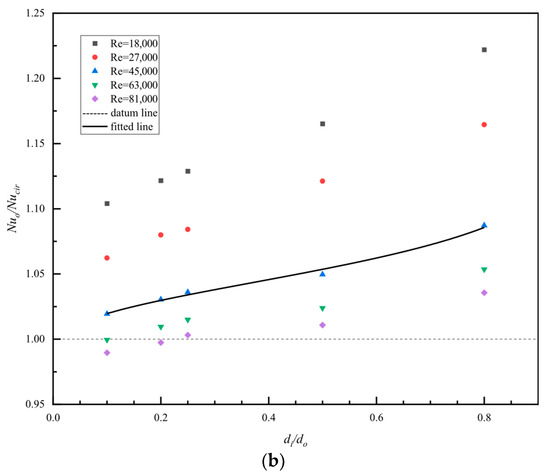 As shown in Figure 9, in the concentric annular pipe, the Nusselt number of the inner wall decreased upon increasing the inner-to-outer diameter ratio. For instance, for di/do = 0.8 in Figure 9a, the dimensionless ratio of the Nusselt number of the inner wall to that of a circular pipe became closer to the reference line. The Nusselt number on the outer wall increased upon increasing the inner-to-outer diameter ratio, but it changed more slowly than that of the inner wall, as shown by the smaller slope in Figure 9b than the one in Figure 9a. Using the equivalent diameter as a characteristic scale, the correlation formula for turbulent heat transfer obtained from experiments in circular pipes produced significant errors when calculating turbulent convective heat transfer in concentric annular pipes. This error was more pronounced on the inner wall surface of concentric circular pipes, especially when the inner and outer diameters were small, such as di/do = 0.1. The Nusselt number error on the inner wall surface reached 62.43%, while that of the outer wall surface reached 22.20%. When calculating the Nucir term in Figure 9 using the Dittus–Boelter formula, the variation in the heat transfer Nusselt number on the inner and outer surface followed the same trend mentioned above. However, the error on the inner surface reached 60.62%, while that on the outer surface was 19.51%. In situations that do not require a high accuracy, this approach can be used, but for cases requiring a higher accuracy, a correction is needed.