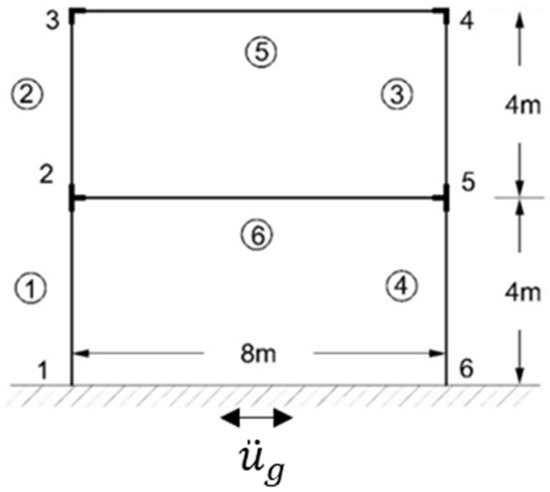 The numerical validation begins with a single-bay, two-story steel frame structure (seen in Figure 1) designed to emulate the key behavioral characteristics of frame-type support structures in OWTs. The frame-type support structure in the OWT represents a highly prevalent structural configuration, which has been extensively studied in Refs. [23,30,39]. The frame consists of four column elements, two beam elements, and four joints with a total of 12 DOFs. The parameters of each element are as follows: the cross-sectional area is , the linear density is , and , where and denote the Young’s modulus and the cross-sectional moment of inertia, respectively. The Rayleigh damping model is adopted and the first two damping ratios are assumed to be 0.01.