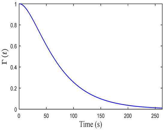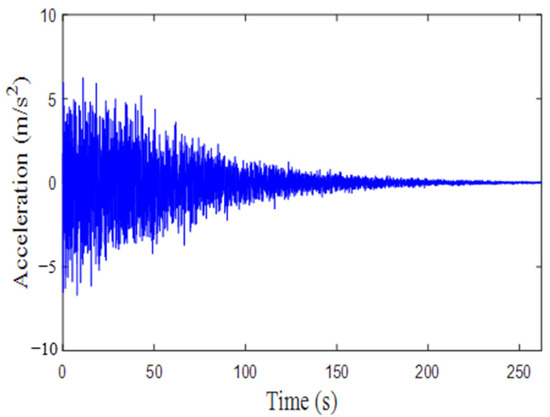in which denotes the ground acceleration. The temporal characteristics of the modulated excitation are presented in Figure 2 and Figure 3. Figure 2 displays the applied amplitude modulation function , and Figure 3 clearly demonstrates the non-stationary nature of the ground acceleration, with its amplitude decaying obviously over time.