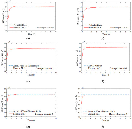 Identified structural stiffness coefficient: (a) k1 in the undamaged scenario; (b) k5 in the undamaged scenario; (c) k1 in the damaged scenario 1; (d) k5 in the damaged scenario 1; (e) k1 in the damaged scenario 2; (f) k5 in the damaged scenario 2.