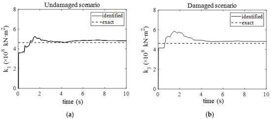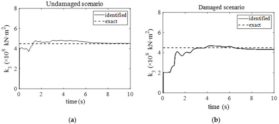 Identified stiffness coefficient of the third element under 5% RMS noise (a) in the undamaged scenario; (b) in the damaged scenario.
