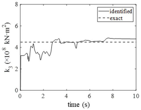 For comparative analysis, traditional EKF-UI is implemented for damage identification alongside the proposed method. The identified stiffness coefficient of the third element under 5% RMS noise by using EKF-UI and the proposed method are presented in Figure 6 and Figure 7, respectively. Figure 6 shows that the results identified using EKF-UI significantly deviate from the exact values, despite convergence. In contrast, the identified stiffness coefficients in Figure 7 rapidly converge near the true values, showing markedly smaller errors than EKF-UI. The proposed method achieves accurate identification for both undamaged and damaged cases.