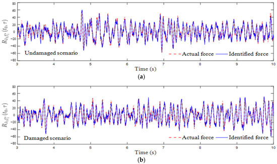 Figure 5b illustrates the sensor configuration, comprising eleven accelerometers and two displacement transducers positioned at nodes 5 and 11 to monitor the dynamic response of the beam. The accelerometers are arranged evenly as far as possible to reduce the adverse impact of the sensor layout on the identification accuracy to the greatest extent. Thus, horizontal acceleration responses are measured throughout the structure, while displacement responses at the 9th and 21st DOFs are incorporated to mitigate the low-frequency drift in the identified excitations. The sampling frequency is 500 Hz, and the horizontal acceleration of node 1 serves as the reference signal for cross-correlation function computation, with the reference time set at . To investigate the effectiveness of the proposed method under different noise conditions, all measurements are intentionally contaminated with 5% and 15% RMS white noise.