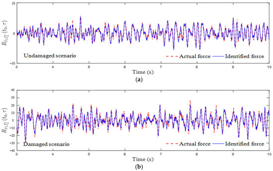 Identified cross-correlation function of unknown input (a) in the undamaged scenario; (b) in the damaged scenario.
