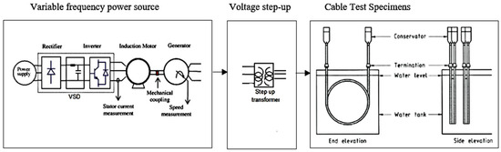 The principle behind testing for the ability to retard the growth of water trees involves aging the cable cores by applying an overvoltage at a higher frequency while the cables are in contact with water and subsequently testing to determine the residual breakdown strength of the insulation [4,5,6]. Accelerated aging of XLPE cables refers to controlled laboratory tests or procedures designed to simulate and speed up the long-term environmental and electrical stresses that cross-linked polyethene (XLPE) cables experience over their service life.