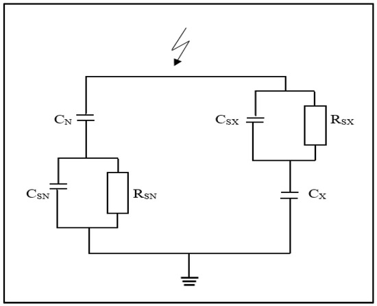 Tan δ measurement circuit. CN—Standard capacitor; CSN—Shunt capacitor for the standard capacitor; RSN—Input impedance; CSX—Shunt capacitor of the test object; RSX—Input impedance; CX—Test object.