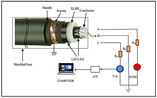 A cable diagnostic system (CDS) was used for IRC measurements. The CDS used a software module with a neuro-fuzzy module to evaluate the IRC measurements on the XLPE power cable. The multistage evaluation software considered the construction characteristics of the test object, categorized the test object’s condition, and provided a prognostic maximum residual voltage level. The isothermal relaxation current (IRC) measurement procedure is illustrated in Figure 5.