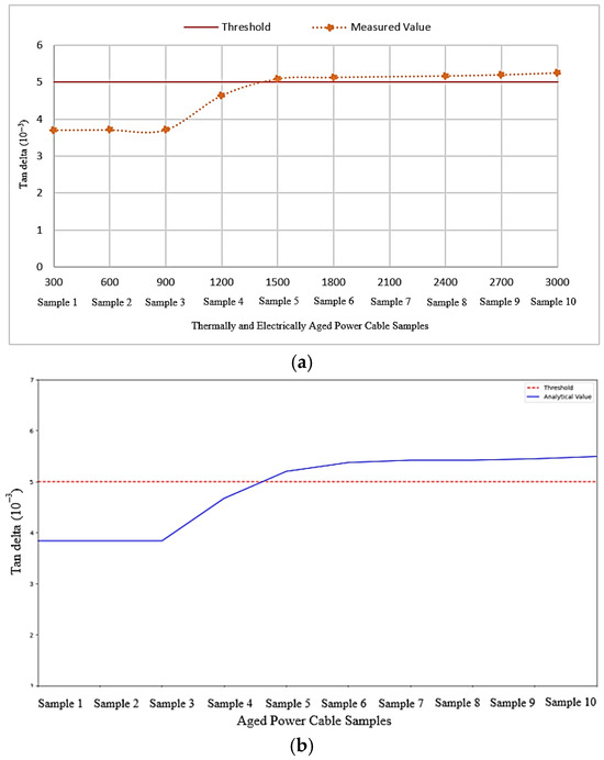 (a) Measured Tan δ of cable samples. (b) Analytical simulated Tan δ of cable samples.