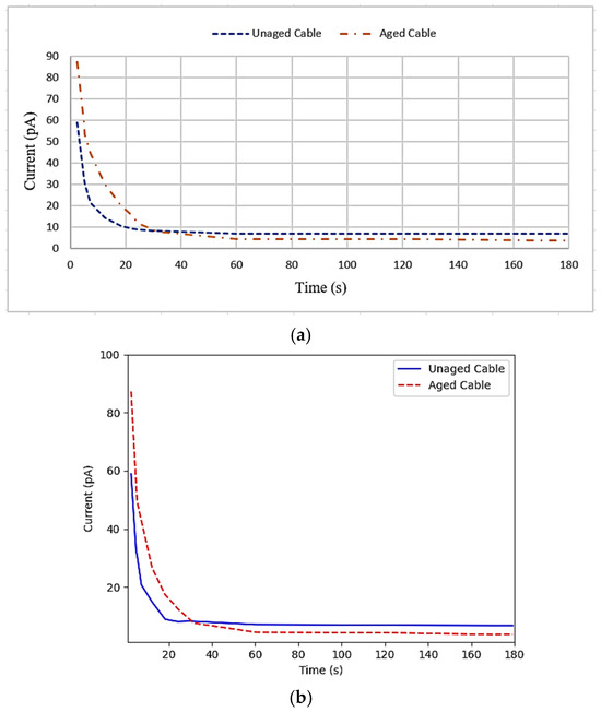 Figure 9a depicts the laboratory depolarization current (IRC) measured on the accelerated-aged and unaged XLPE power cable samples.