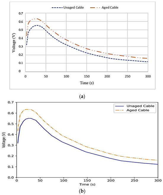 The magnitude of the leakage current in the tested XLPE power cable samples was proportional to the height of the return voltage. The change in the return voltage with time resulted from the gradual relaxation of the excited dipoles and a decrease in the polarization. As a result of the applied voltage, conduction and polarization currents flow in the circuit, and the dielectric response is observed. The RVM reflects the surface conductivity and charge mobility. The peak voltage and time to peak indicate the relaxation processes, leakage, and/or conduction paths. Figure 11a depicts the laboratory RVM test measurements of the accelerated-aged and unaged XLPE power cable samples.