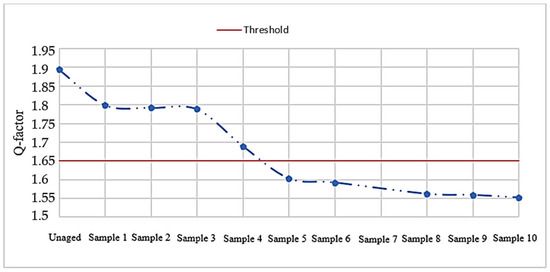Referring to the empirical evaluation of the Q-factor, as depicted in Figure 12, the unaged cable sample was dry with a Q-factor of 1.894. In contrast, cable sample one (300 h) with a Q-factor of 1.799, cable sample two (600 h) with a Q-factor of 1.792, and cable sample three (900 h) with a Q-factor of 1.788 indicated some moisture content in their respective dielectrics. Cable sample four (1200 h) had a slightly high moisture content (Q-factor 1.689), but it was below the threshold. The cable samples, with Q-factors of 1.603, 1.592, 1.562, 1.559, and 1.552, for five (1500 h), six (1800 h), eight (2400 h), nine (2700 h), and ten (3000 h), respectively, were above the threshold, indicating aging. The Q-factor of the cable samples show a non-linearity of the initial slope of the return voltage, suggesting that thermal pre-conditioning and electrical aging affect the XLPE power cable insulation.