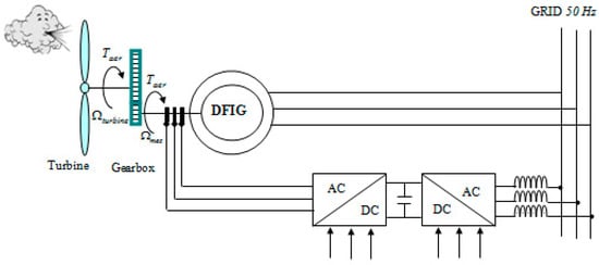 The conversion system is shown schematically in Figure 4. The machine’s stator side is directly connected to the grid. The rotor circuit is powered by an inverter controlled by the PWM technique.
