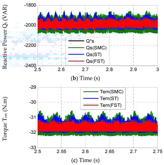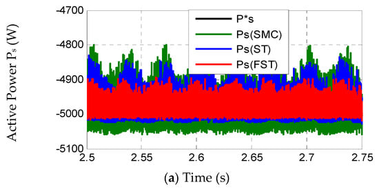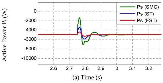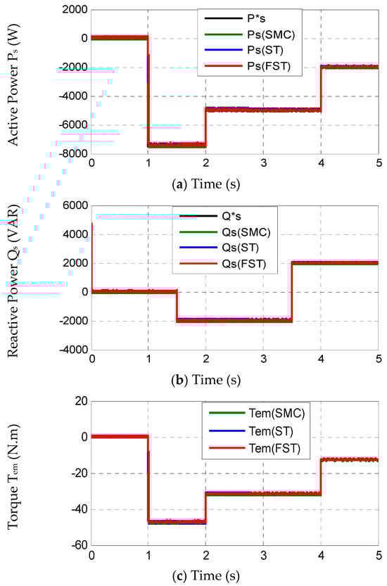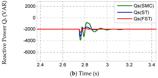 The active and reactive power responses for the three controllers—SMC, ST, and FST—are shown with varying speeds in Figure 7.