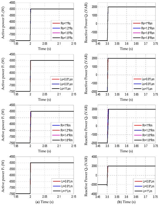 The results of the tests carried out show that the regulation of the active and reactive stator powers is always carried out and that only the variation in the rotor parameters slightly affects the response time of the system (Figure 8).