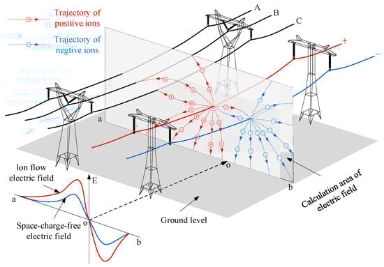 There are two kinds of hybrid transmission lines: HVAC and HVDC lines on one tower, and parallel HVAC and HVDC lines on different towers. Because the electric field at HVDC conductor surface is changed with the power frequency cycle under the influence of HVAC lines, the corona discharge of parallel HVDC conductors is changed, and then space charges distribution is different from HVDC lines without parallel HVAC lines, which is illustrated in Figure 1. A, B, and C represent the three-phase HVAC conductors; “+” and “−” represent the positive and negative HVDC poles. A 2D plane perpendicular to the line shows ion flow trajectories and the ground electric field along segment ab from the DC lines is shown, which clearly manifests the influence of the AC lines. Due to the mutual influence of parallel AC and DC lines [3,4], with challenges posed for fault analysis and corona analysis of the lines additionally [5,6,7], the ion flow field becomes more complicated, which is the superposition of electric field generated by conductor surface charges and space charges due to the corona discharge [8].