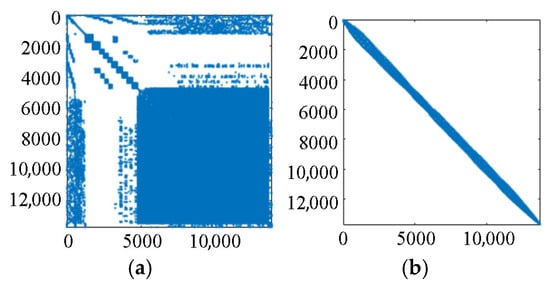 Comparison of coefficient matrix before and after RCM reordering: (a) Unsorted; (b) RCM-Sorted.