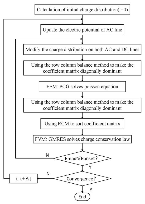 The accelerated solution procedure is shown in Figure 3. An inner loop and an outer loop are included in the iteration. The inner loop adjusts the surface charge distribution on AC and DC lines to ensure that the surface electric field does not exceed the corona onset threshold. The outer loop performs time-domain iteration until the convergence condition is reached. The acceleration process is applied to handle the coefficient matrices in the inner loop.