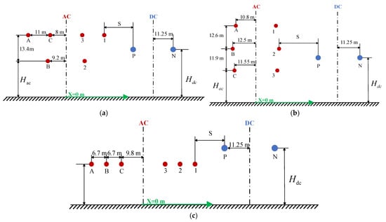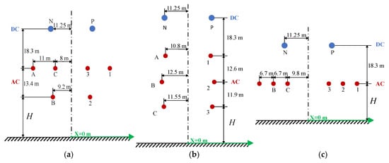 HVDC and HVAC lines on different towers: (a) Inverted Triangular Arrangement; (b) Vertical Arrangement; (c) Horizontal Arrangement.