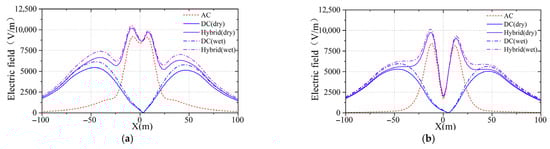 As an example, Figure 6 illustrates the ground-level electric field for two kinds of arrangements with phase sequence I in non-residential areas, where the zero X coordinate is the center of the AC transmission circuit. The hybrid electric field distribution of HVAC-HVDC lines on one tower is respectively illustrated as AC electric field, DC electric field and the superposition of AC and DC electric field. The results of the inverted triangular arrangement when H is 12.5 m are illustrated in Figure 6a. The results of the vertical arrangement when H is 12 m are illustrated in Figure 6b. For the inverted triangular and vertical arrangement, AC peaks are closer to the center, while DC peaks are far from the center. The staggered peak distribution is helpful to keep the normalized hybrid electric field below the limit. If the arrangement of conductors is the same, the peak values are higher under wet conditions than under dry conditions, because the corona onset electric field under wet conditions is lower.