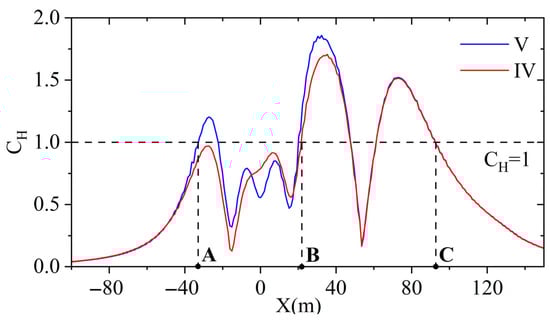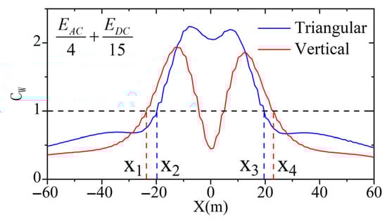 For the inverted triangular and vertical arrangements, the corridor widths determined by edge conductors (93.5 m and 80.5 m, respectively) are smaller than those based on the hybrid electric field. Therefore, for these two arrangements, the corridor width should be determined by the hybrid electric field. However, for the horizontal arrangement, the corridor width determined by edge conductors is 101 m, which is larger than the results of phase sequences II, IV and VI. In order to discuss it in detail, the CW of phase sequences IV and V is illustrated in Figure 10. The width for phase sequence V according to (16) is the distance between A and C, while for phase sequence IV, the width is the distance between B and C. It means that the electric field at the AC side of the phase sequence IV is very low, which is not a decisive factor for the corridor width. Therefore, the corridor width should be determined by the position of the outer AC line.