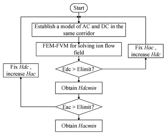 For HVAC-HVDC lines on different towers, extensive calculations are required to determine the minimum height of AC and DC lines, represented by Hac and Hdc. The calculation procedure is shown in Figure 8. A set of calculations by fixing Hac (or Hdc) while varying Hdc (or Hac) are completed one by one.