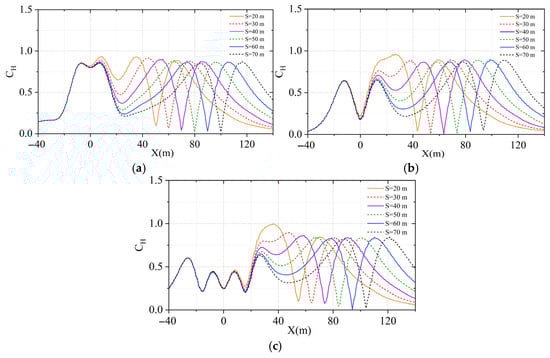Table 9 lists the electric field, RI and AN for three kinds of arrangements in Figure 5, where the horizontal approaching distance S is 20 m, with the height of AC lines (Hac) 11 m and the height of DC lines (Hdc) 17 m. In non-residential areas, only the CH value in Table 9 exceeds the limits in Table 5, indicating that the hybrid electric field is the main design constraint. In residential areas, both the ion current density under wet conductor conditions and CH exceed the limits, so both the electric field and ion current density are the main design constraints. Calculation results for other phase sequences indicate that the constraint factor is not changed with phase sequence. Because the electric field is stronger under wet conditions than under dry conditions, the following discussion on the approaching distance, minimum height and corridor width will be under wet conditions.