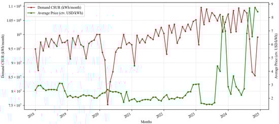 Comparative monthly evolution of electricity demand in the South Central Regional Electric Company (CENTROSUR) (in kWh/month) and the average unit energy supply price (USD cents/kWh) during the 2018–2024 period.
