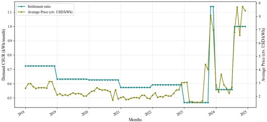 Monthly evolution of the settlement ratio and the average unit energy supply price (USD cents/kWh) between 2018 and 2024.