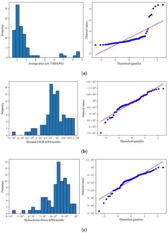 Histograms and Q–Q plots for the normality analysis of the variables: (a) average price, (b) Demand, (c) Hydroelectric Power.