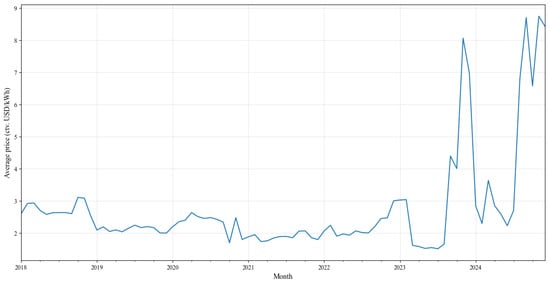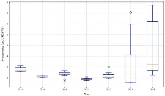 Figure 4 shows that the average energy prices (in USD/kWh) exhibit low variability and consistent values between 2018 and 2022, with medians close to 2 and 3 (USD cents/kWh) depending on the year. In contrast, the years 2023 and 2024 show notable increases in both medians and variability, indicating a significant change in price patterns. Additionally, outliers are identified in 2020, 2021, 2022, 2023, and 2024, highlighting unusual fluctuations during these periods.