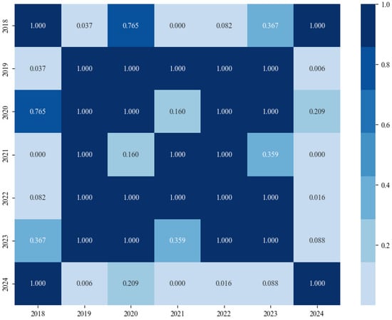 To complement the Kruskal–Wallis H results and identify specific pairwise differences in average energy prices across years, Dunn’s post hoc test was applied with Bonferroni correction. The resulting heatmap (Figure 5) presents adjusted p-values for all year-to-year comparisons. Darker cells correspond to non-significant differences (), while lighter tones highlight statistically significant contrasts.