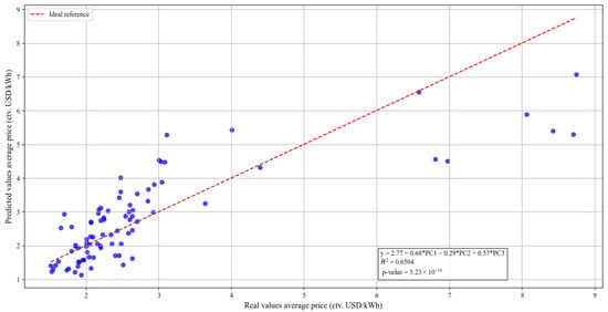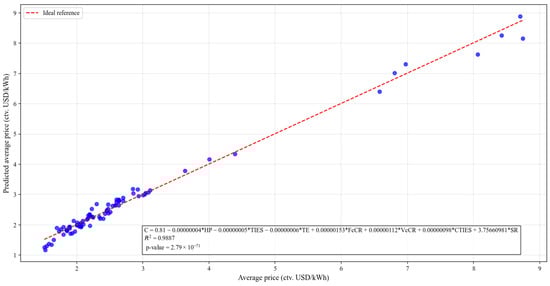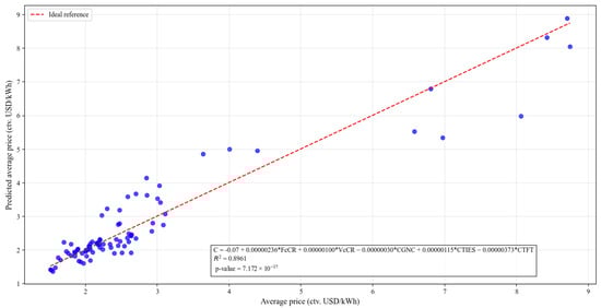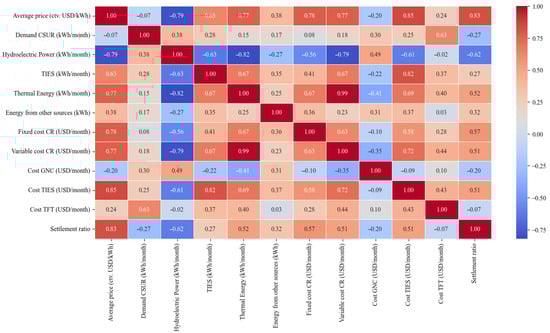 Figure 6 shows the correlation matrix calculated among all numerical variables in the dataset, including the average price. The column and row corresponding to the average price (USD cents/kWh) are notable, as it is the dependent variable. It exhibits a strong positive correlation with several cost variables, such as Cost TIES (), Settlement ratio (), Fixed cost CR (), Variable cost CR (), and generated Thermal Energy (). This suggests that the unit energy price increases as associated costs rise, especially with higher generation of Thermal Energy. Conversely, the average price shows a strong negative correlation with Hydroelectric Power (), indicating that in years of higher hydropower generation, the average price tends to be lower.