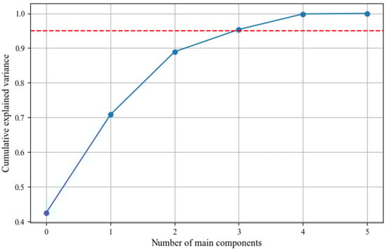 To determine the optimal number of principal components, the cumulative variance explained by each component was analyzed. As shown in Figure 7, the first three principal components explain approximately 95% of the total data variability, exceeding the 90% threshold (considered a standard criterion in this analysis). Consequently, the first three principal components were selected for subsequent analyses.