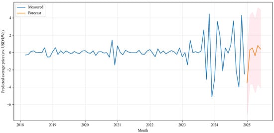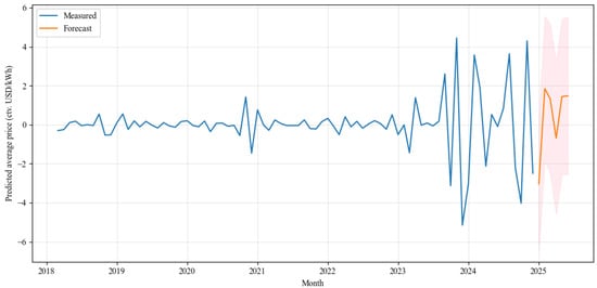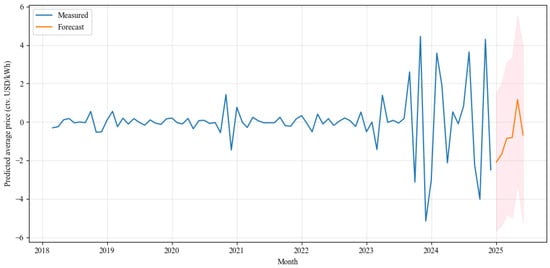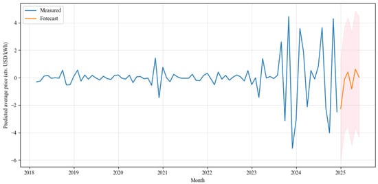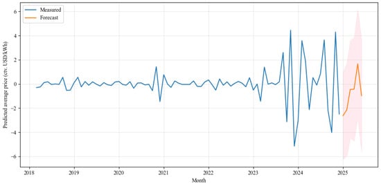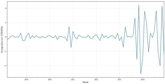 Figure 3a shows the distribution of the average price, which is neither symmetric nor unimodal due to the concentration of most values between 2 and 3 USD cents/kWh. However, some months exhibit relatively high prices (7–8 USD cents/kWh), revealing a cluster of elevated values. In the Q–Q plot, a noticeable deviation from the red reference line is observed, particularly in the upper and lower tails. This clear deviation confirms that the average price does not follow a normal distribution (Shapiro–Wilk: ), implying that the normality assumption must be rejected.