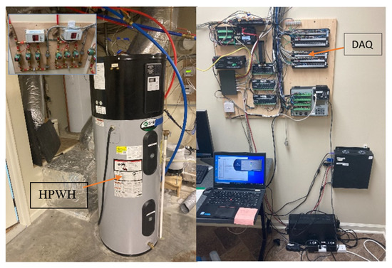 Tested heat pump water heater (HPWH, (left image)) unit and experimental setup with data acquisition (DAQ) system (right image) installed in research and demonstration house used in this study.