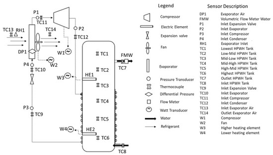 The remaining two TCs are placed at heights at the exact location of the temperature sensors that control the electric resistance heaters on the water heater. In addition, the inlet and outlet ambient air conditions at the evaporator coil are monitored. The water flow rate is measured at the outlet of the water heater. The DAQ system controls each draw’s flow rate and total volume. Finally, the power consumption is measured using watt transducers with a nominal accuracy of 0.5%. A Campbell instrumentation system was used for data acquisition during the experiment in which measurements were recorded every 15 s, 1 min, and 60 min.