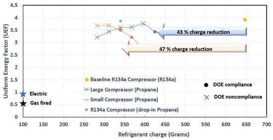 R290 charge amount vs. UEF in four tested compressor units. Solid circles mean compliance with US Department of Energy (DOE) Unified Energy Factor (UEF) test and x’s mean the outlet temperature conditions were not met for all water draws. For comparison, the UEF of Electric water heaters and Gas fired water heaters is included on the Y axis.