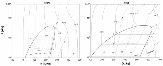 Pressure (P) vs. enthalpy (h) graphs of the vapor compression cycle for refrigerants R134a (left) and R290 (right) in vapor compression cycle.